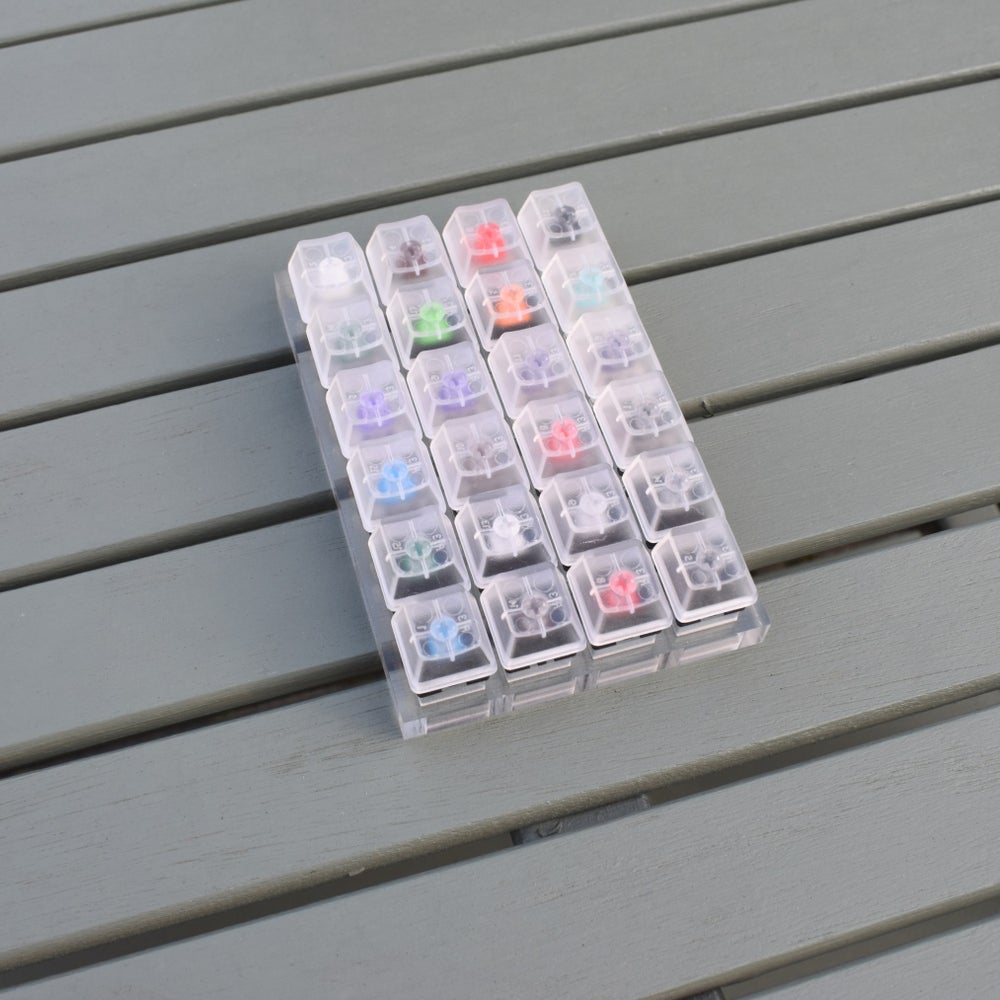 The plate of the tester is a single block of acrylic which provides a firm base. The switch tester includes translucent keycaps, so that you can see which switch you are testing during use.